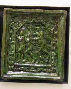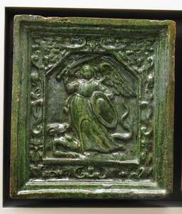 Ofenkachel mit Darstellung der Königin Sophie von Dänemark (?) und zweier Landsknechte