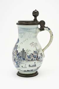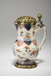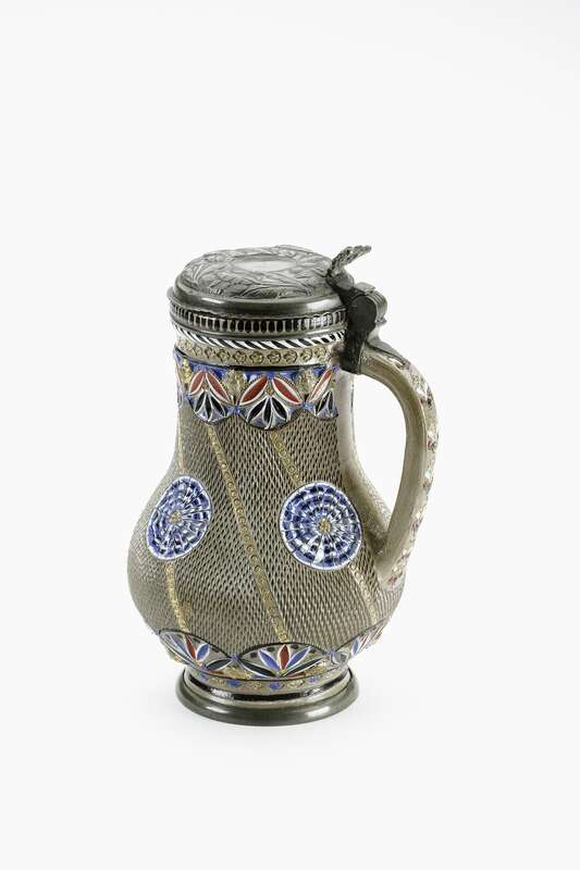 Steinzeug, Salzglasur, polychrome Emailmalerei, teilweise vergoldet; Zinnmontierung wohl von Samuel Günther d. Ä.,Freiberg