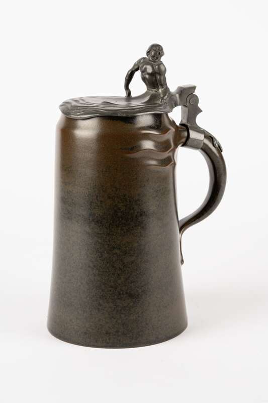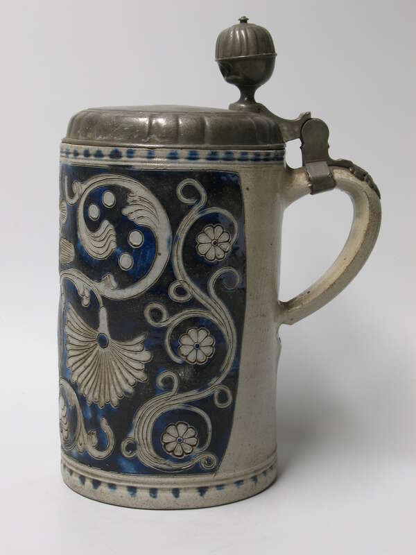 Steinzeug, Kobalt- und Mangansmalte, Salzglasur; Zinnmontierung