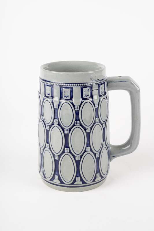 Steinzeug, Salzglasur, polychrome Emailmalerei; innen vergoldete Silbermontierung mit Medaille auf den sächsischen Kurfürst Johann Friedrich I., von Hans Reinhart d. Ä.
