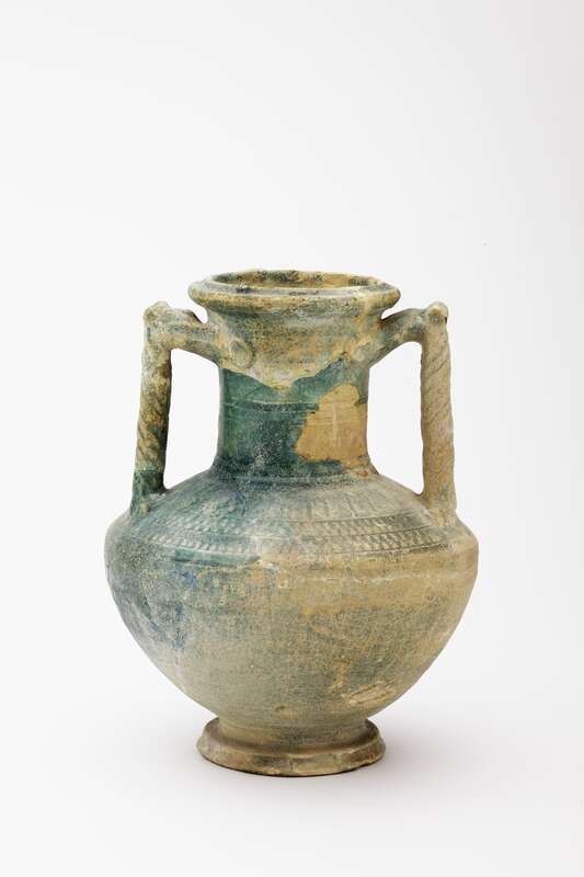 Irdenware; heller Scherben; gedrehte Henkel; reliefierter Dekor; opake blaugrüne Glasur.