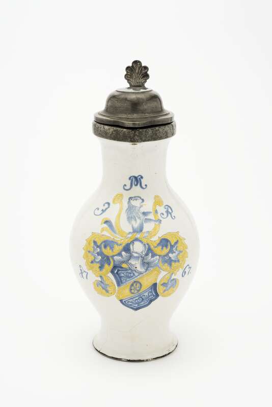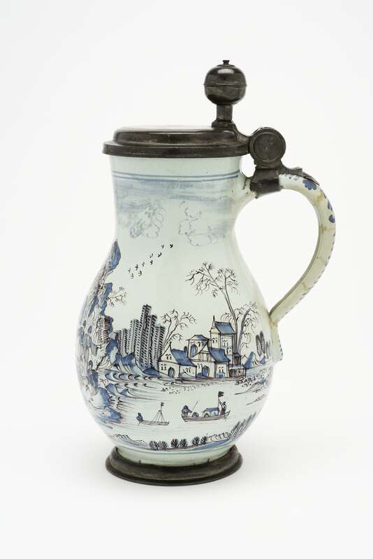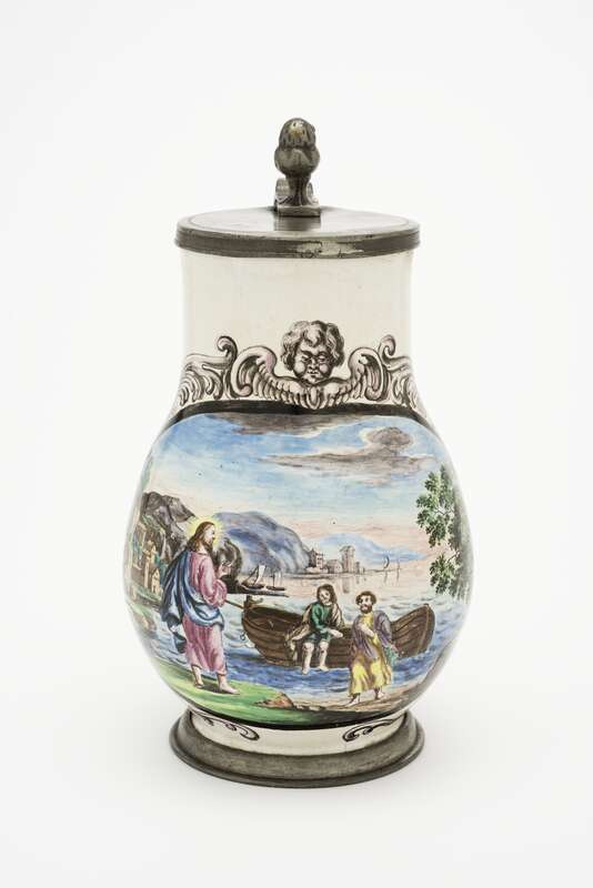 Fayence, Scherben ockerfarben, Glasur milchig-weiß, Aufglasurbemalung in Blau, Rot, Braun, Grün, Gelb und Schwarz; Zinnmontierung
