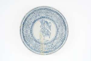 Fayence, Scherben ockerfarben, Glasur weiß mit hellblauem Stich, Inglasurbemalung in Blau