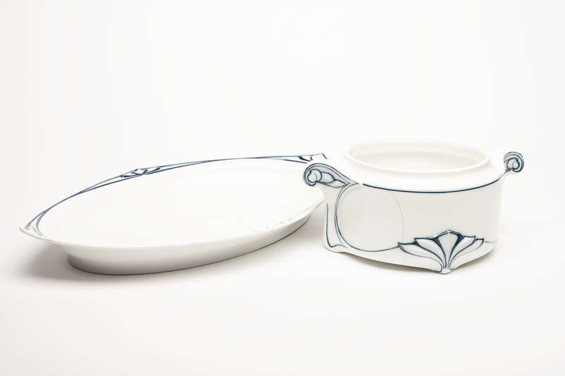 4 Teile aus dem Tafelservice "Eckform" mit Maßwerk-Dekor (1 ovale Anbietplatte, 1 runde Anbietplatte, 1 Speiseteller, 1 Terrine ohne Deckel.)um 1905