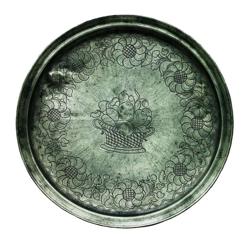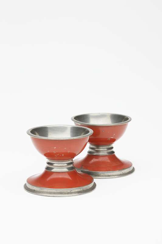 Zinn, gegossen, graviert, geflechelt, rot lackiert