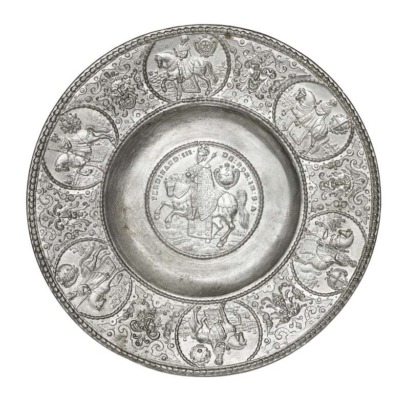 5 Teller mit dem Reiterbildnis Kaiser Ferdinands III. (neuzeitliche Abformungen nach historischem Nürnberger Vorbild um 1636)um 1636 (neuzeitliche Abformungen)