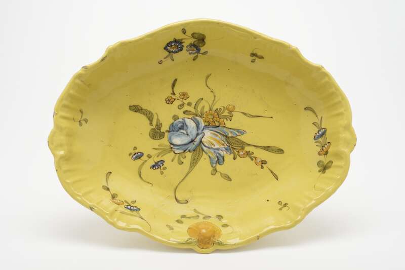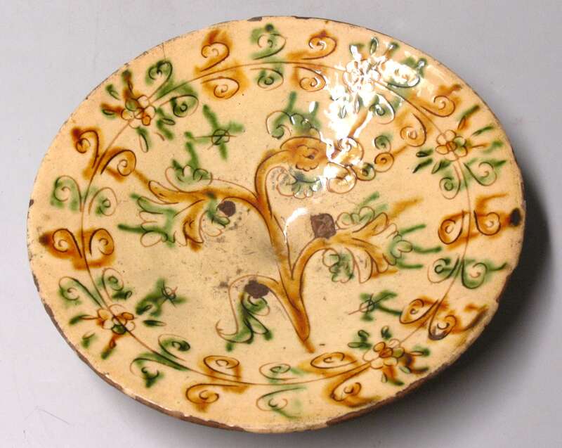 Fayence, Scherben ockerfarben, Glasur gelb Inglasurbemalung in Blau, Grün und Manganviolett auf gelbem Grund