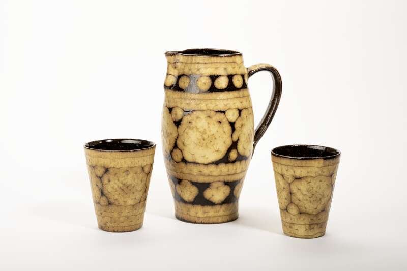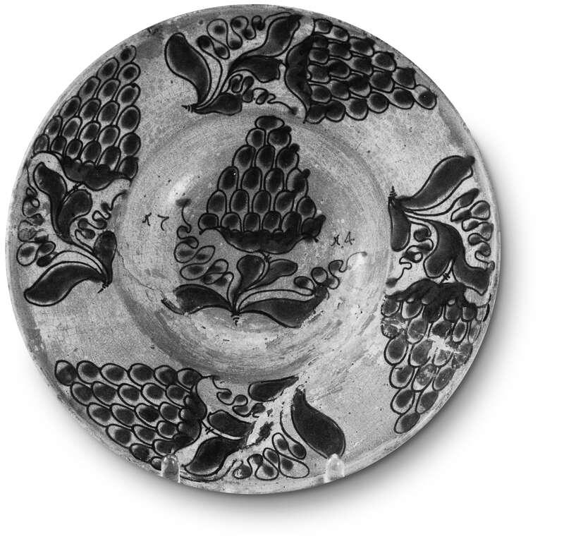 Fayence. a) Scherben sandfarben, Glasur weiß, Aufglasurbemalung in Purpur, Grün, Blau, Gelb und Braun b) Scherben sandfarben, Glasur weiß, Aufglasurbemalung in Purpur, Grün, Blau, Gelb, Violett und Braun