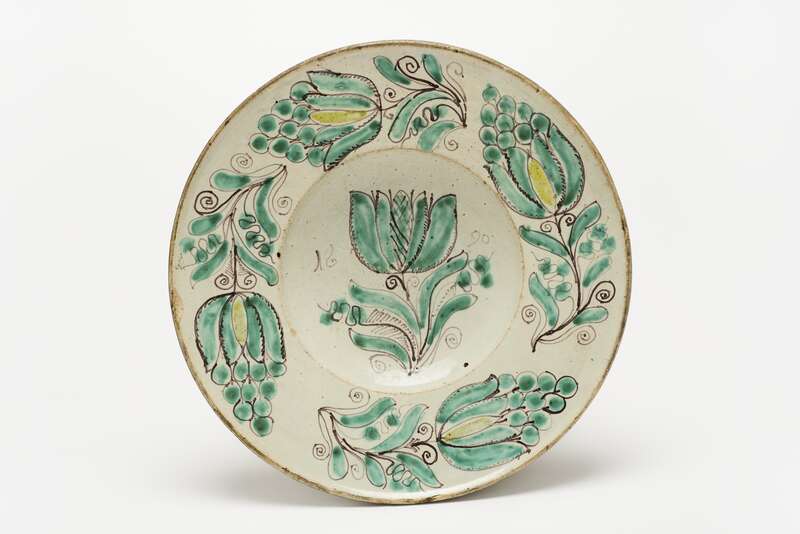 fayence, Scherben ockerfarben bis hellgelb, Glasur hellgrau, Inglasurbemalung in Grün, Gelb und Manganviolett (Konturen)