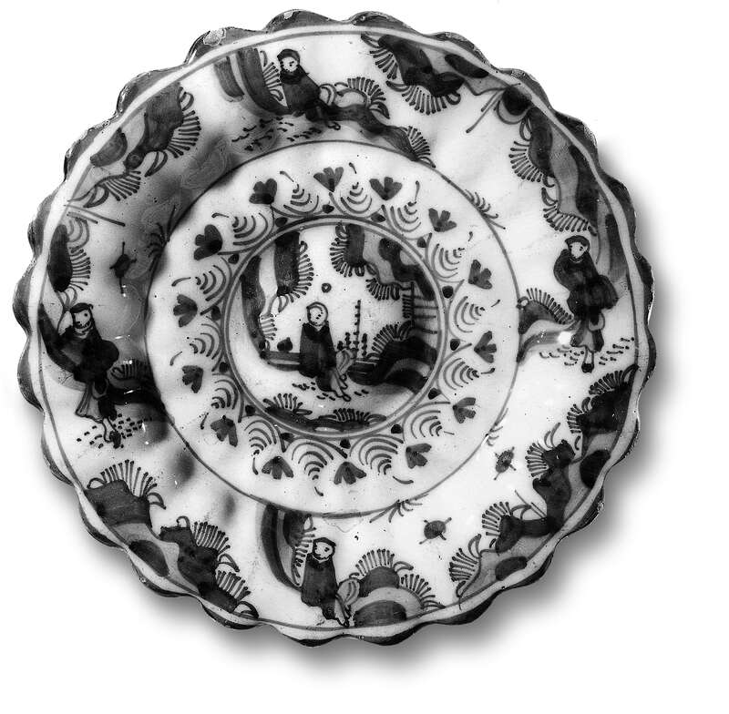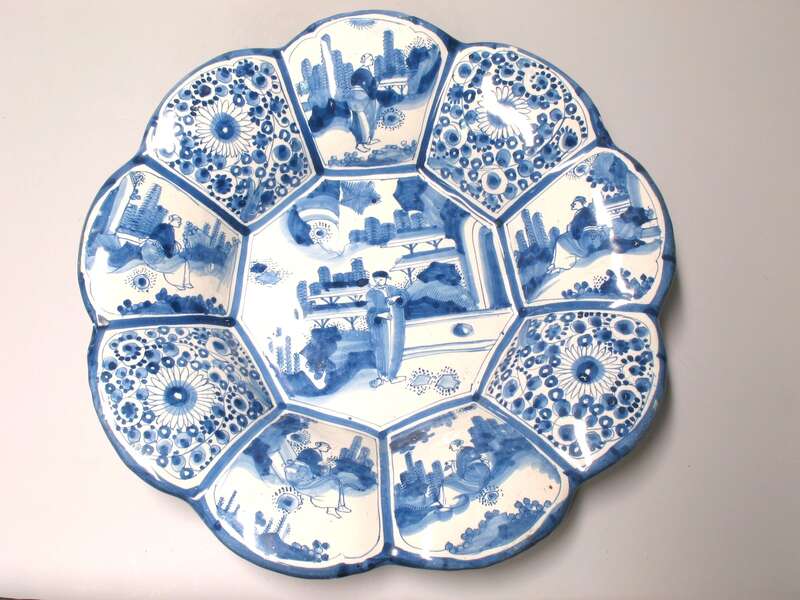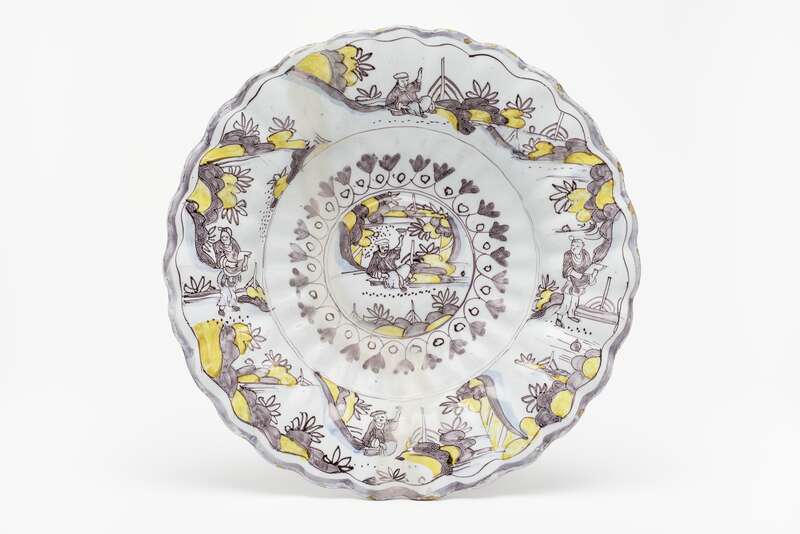 Fayence. a) Scherben sandfarben, Glasur weiß, Aufglasurbemalung in Purpur, Grün, Blau, Gelb und Braun b) Scherben sandfarben, Glasur weiß, Aufglasurbemalung in Purpur, Grün, Blau, Gelb, Violett und Braun
