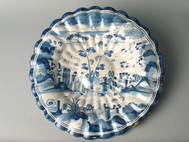 Fayence, Scherben ockerfarben, Glasur weiß, Inglasurbemalung in Kobaltblau