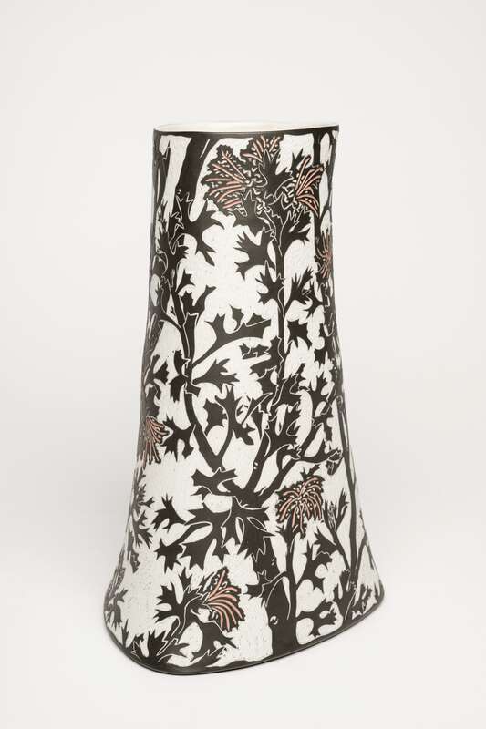 sgraffito on porcelain vessel, with engobe, glaze and underglaze