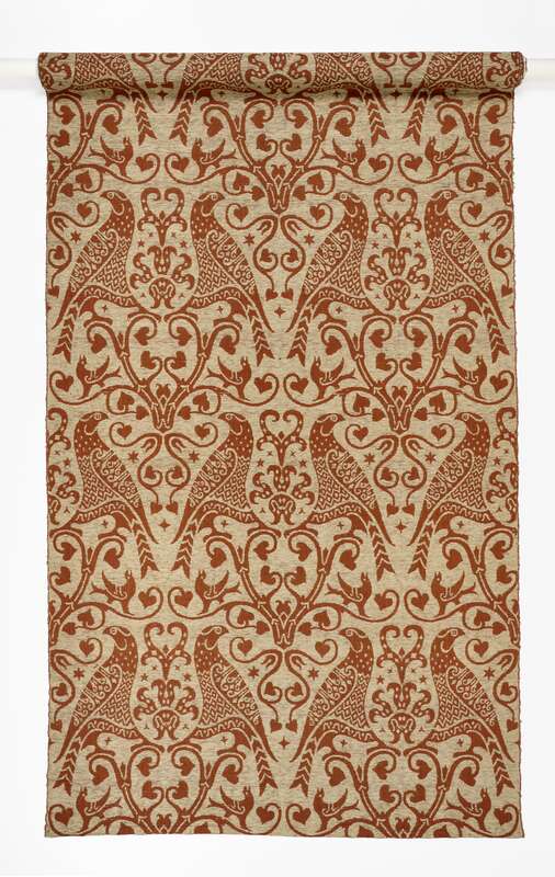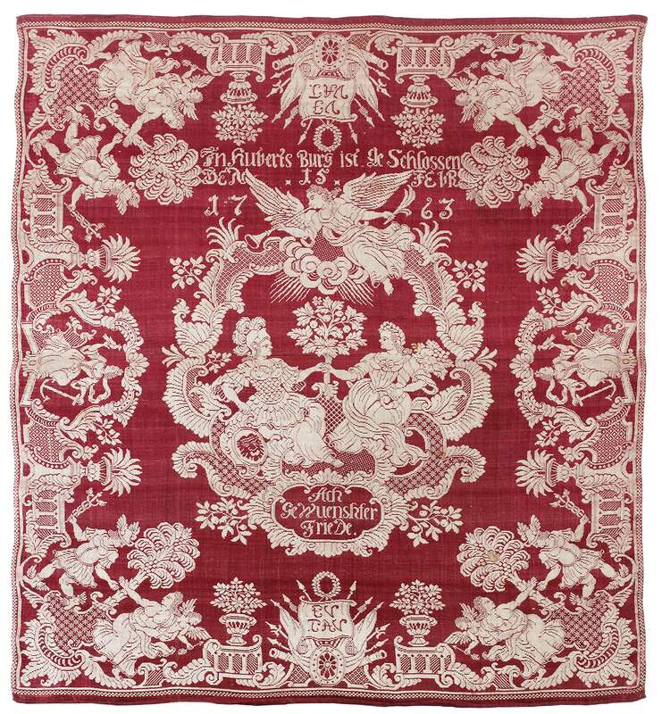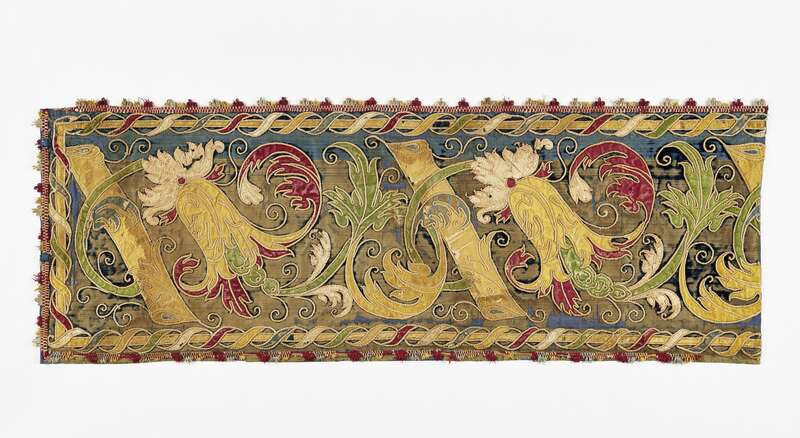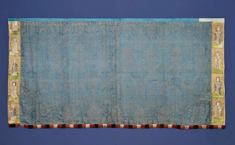 Gewebe: Seide, Häutchengoldfäden, Lampas/ Stickerei: Leinen, Seide, Häutchengoldfäden