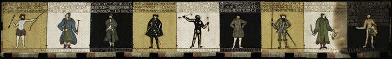 Wolle, Leinen- und Köperbindung, gestickte Konturen, aus fünf einzeln gewebten Bahnen zusammengesetzt