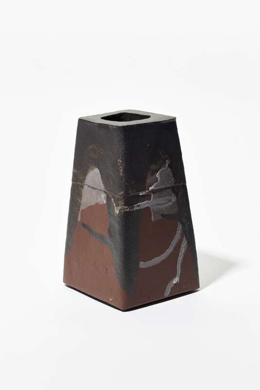Steinzeug, weißer Schamotte-Ton (Westerwald, gebaut. Glasur: Manganerz, Siena-Erde, Apfelbaumasche (Holland), im E-Ofen bei 1.270 °C oxidierend gebrannt