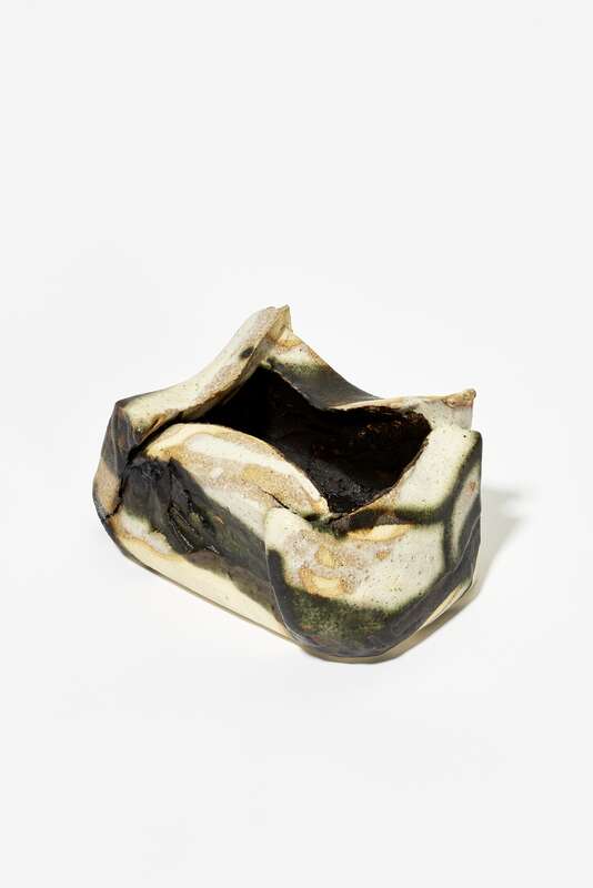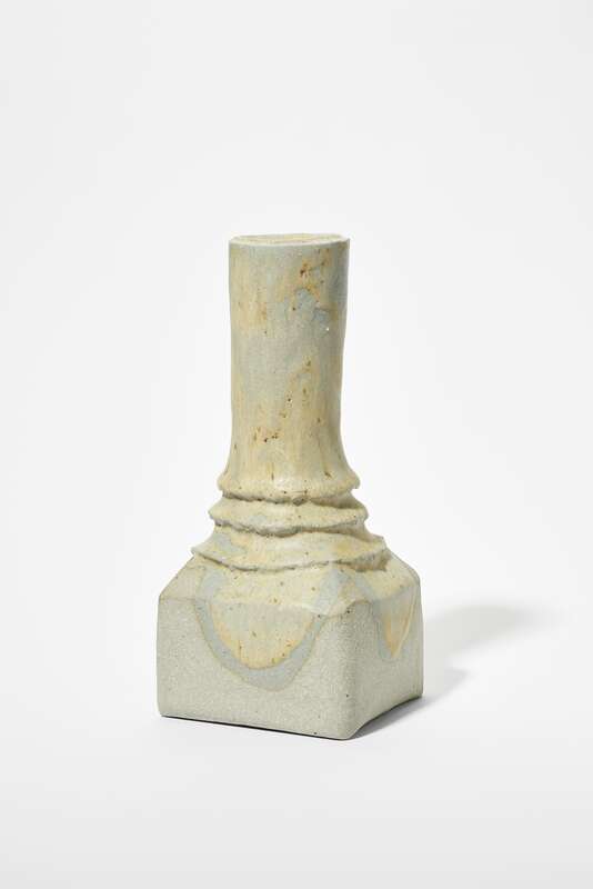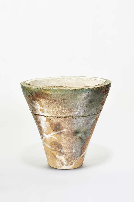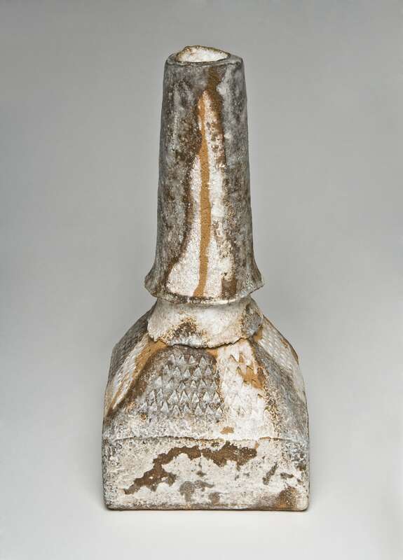 Steinzeug, beiger Schamotte-Scherben, gebaut; Glasur: weißer Ton, Steinmehl (Granit und Gneis), Weinrebenasche; gebrannt im Elektroofen bei 1.280°C