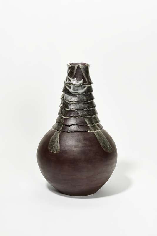 Steinzeug, bräunlicher Schamotte-Scherben (Westerwald), gebaut. Glasur: weißer Ton, Weinrebenasche, Manganerz; gebrannt im Elektroofen bei 1.280°C