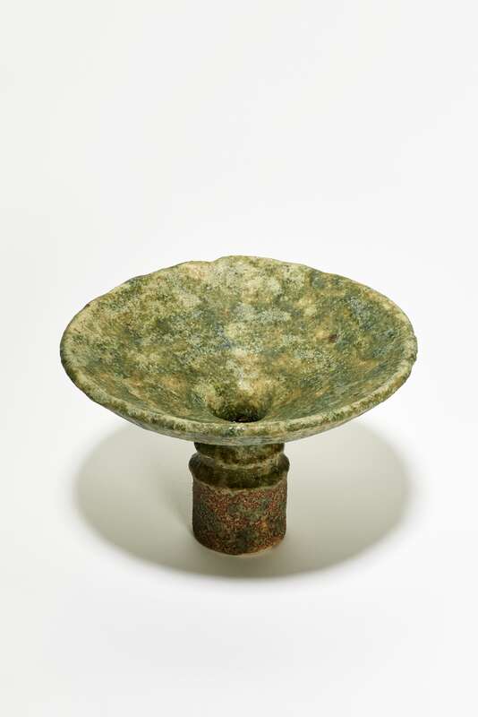 Schamottiertes Steinzeug, bräunlicher Scherben, gebaut. Glasur: Kaolin, Malachit, Apfelbaumasche; zwei Mal oxidierend gebrannt im Elektroofen bei 1280 °C