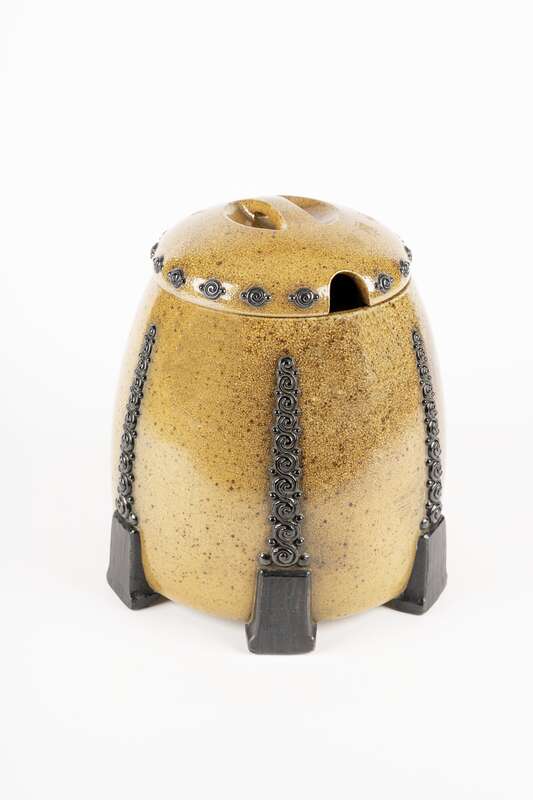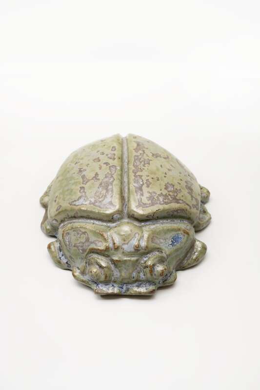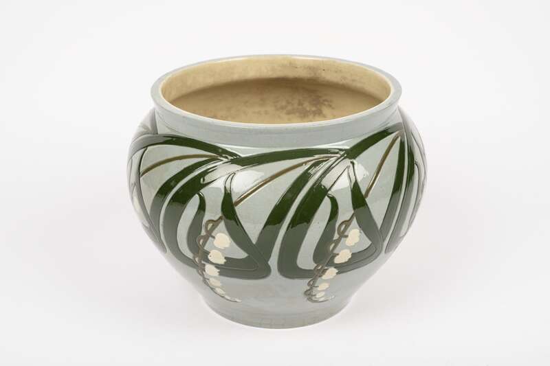 Steinzeug, beigefarbener Scherben, innen beige, außen graugrün glasiert. Einritzungen bemalt in grün, braun und weiß