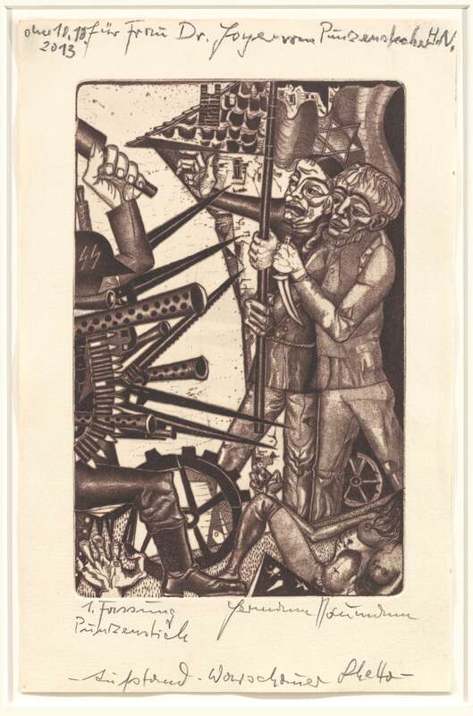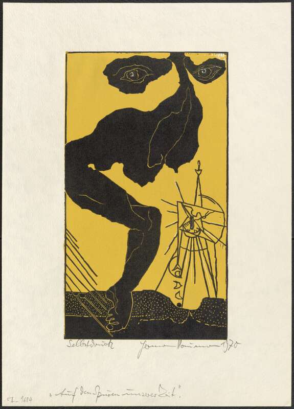 Ein bemerkenswertes Konvolut bilden die kraftvoll mit Ölkreide auf große Bögen gezeichneten Kompositionen, die unter dem Eindruck einer Reise nach Westberlin 1959 entstehen (z. B. „Kurfürstendamm“, Inv.-Nr. B.2024-371). Mit ihrer eigenwilligen Adaption avantgardistischer Tendenzen der 1920er Jahre stehen sie zweifellos quer zur seinerzeit offiziellen Kunstdoktrin der DDR. Dies gilt ebenso für seine – teils unrealisiert gebliebenen – Entwürfe für baugebundene Arbeiten, etwa die Glasfenster zum Thema „Neue Architektur“ für ein Studentenwohnheim der Technischen Hochschule (heute TU) Dresden (Inv.-Nr. B.2018.59/39, nach 1990 demontiert, Verbleib unbekannt) oder das 1959 aus Meißner Keramikfliesen gefertigte Brunnenmosaik „Unterwasser“ (Inv.-Nr. B.2018.59/37) für einen der beiden sogenannten Zwillingsbrunnen am Dresdner Ringcafé (zerstört und 2008 am Sachsenplatz rekonstruiert) mit ihrer Tendenz zur flächig-ornamentalen Abstraktion.